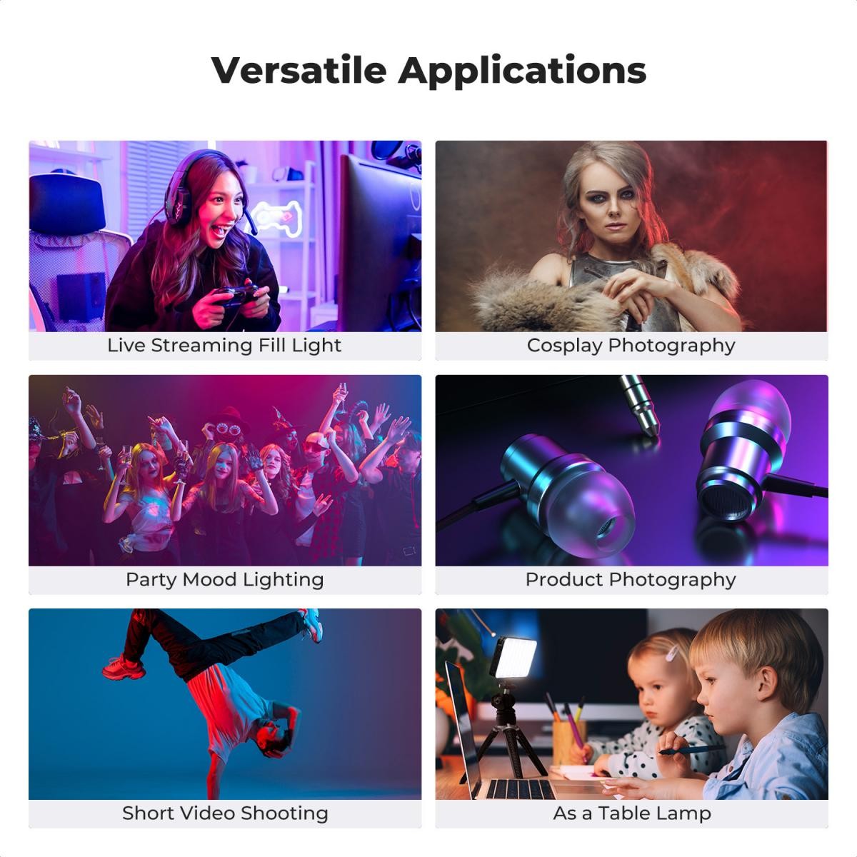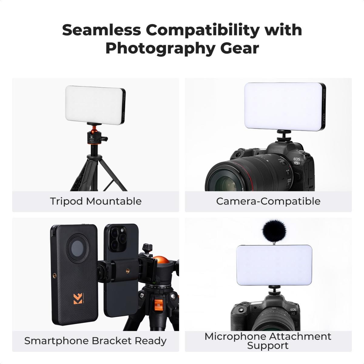 Der große Akku mit einer Kapazität von 5000 mAh ermöglicht bis zu 2,5 Stunden Dauerbetrieb bei maximaler Helligkeit. Dank USB-C-Aufladung und USB-A-Ausgang kann die Leuchte auch als Notfall-Powerbank zum Aufladen Ihres Smartphones beim Vloggen im Freien oder beim mobilen Filmen verwendet werden.