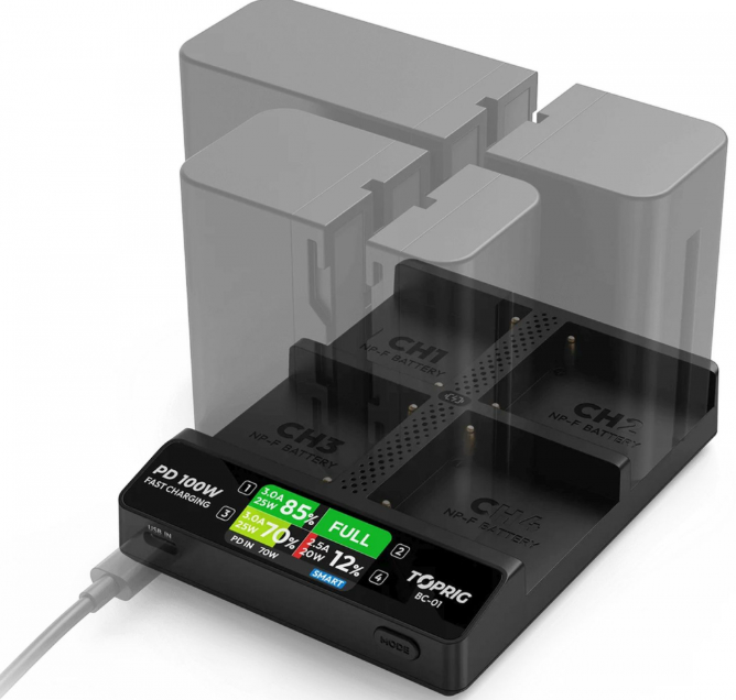 Das Accsoon TopRig 100W 4-Bay NP-F Schnellladegerät mit EU-GaN-Ladegerät ist ein leistungsstarkes, intelligentes Ladegerät für Akkus vom Typ NP-F. Es verfügt über vier unabhängige Ladeplätze, automatische Akkuerkennung und einen USB-C-PD-100W-Eingang für schnelles, stabiles und sicheres Laden.