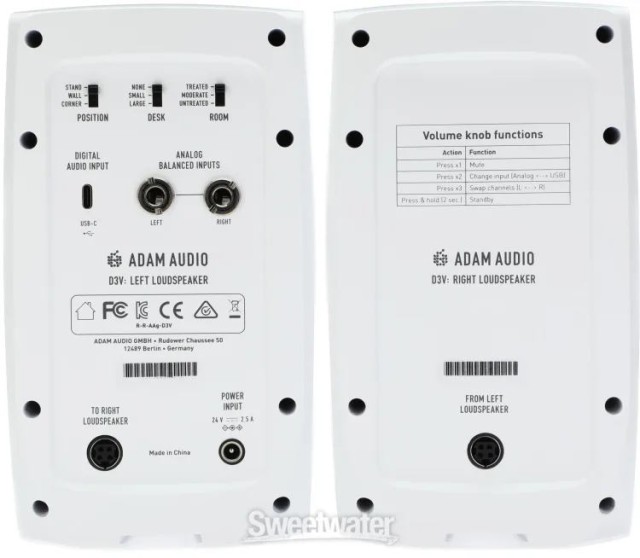 Ausgestattet mit einem USB-C-Eingang und zwei symmetrischen Klinkenbuchsen bietet der D3V hochwertige digitale und analoge Anschlüsse. Zu den übersichtlichen Bedienelementen gehören ein Multifunktions-Lautstärkeregler, intuitive Raumkompensationsschalter und eine mehrfarbige Statusanzeige. Das D3V wird mit abnehmbaren Monitorständern und eingebauten Mikrofonständerhalterungen mit Gewinde (3/8″) für eine perfekte Positionierung in jeder Umgebung geliefert.