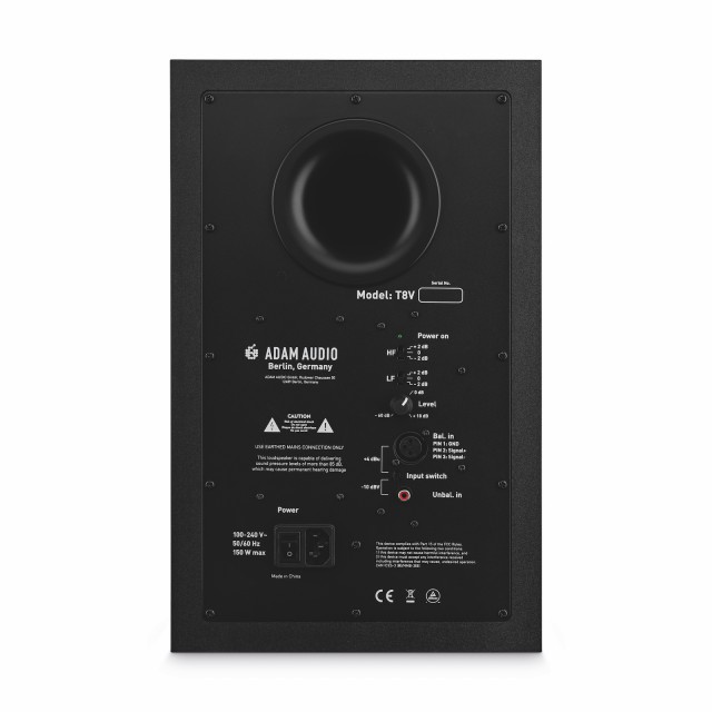 Auf der Rückseite befinden sich symmetrische XLR- und unsymmetrische Cinch-Eingänge sowie Regler für die Eingangsempfindlichkeit, die Verstärkung und die Hoch- und Tieflage. Das Adam Professional Audio T8V wird mit einem Netzkabel geliefert.