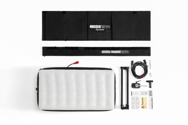 Das INFINIMAT-System von Aputure zeichnet sich durch seine Kompaktheit und Praktikabilität aus. Die aufblasbare Softbox streut das Licht sehr gut und macht es deutlich weicher, ist aber deutlich kleiner als klassische Diffusorlösungen. Zur Aufbewahrung wird die INFINIMAT-Softbox einfach entleert. Die Packung enthält umfangreiches Zubehör wie ein Lichtgitter und einen Lichtschirm.