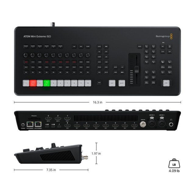 Der ATEM Mini Extreme ISO G2 ist der ideale Mischer für den Aufbau eines hochwertigen Sendestudios mit 8 HDMI-Eingängen, integrierter Streaming-Engine, Multi-View, Thunderbolt für Aufnahme und Wiedergabe, USB-Webcam, DVE, Chroma-Key, Media-Player und ISO-Aufnahme aller 8 Videoeingänge. Er verfügt über 3 unabhängige Videoausgänge, die geroutet werden können.