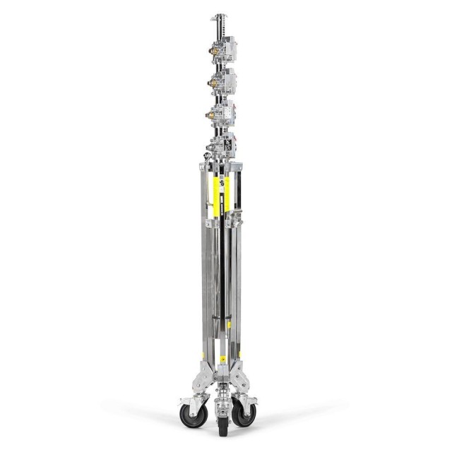 Der Ständer besteht aus verchromtem Stahl mit gravitätsgegossenen Aluminiumkomponenten und verfügt über ein mehrteiliges Design, das außergewöhnliche Festigkeit und Steifigkeit bietet. Er bietet eine maximale Arbeitshöhe von bis zu 610 cm und eignet sich daher für große Studioumgebungen, Filmsets und Rundfunkanwendungen, die eine erhöhte Rigging-Ausrüstung erfordern.