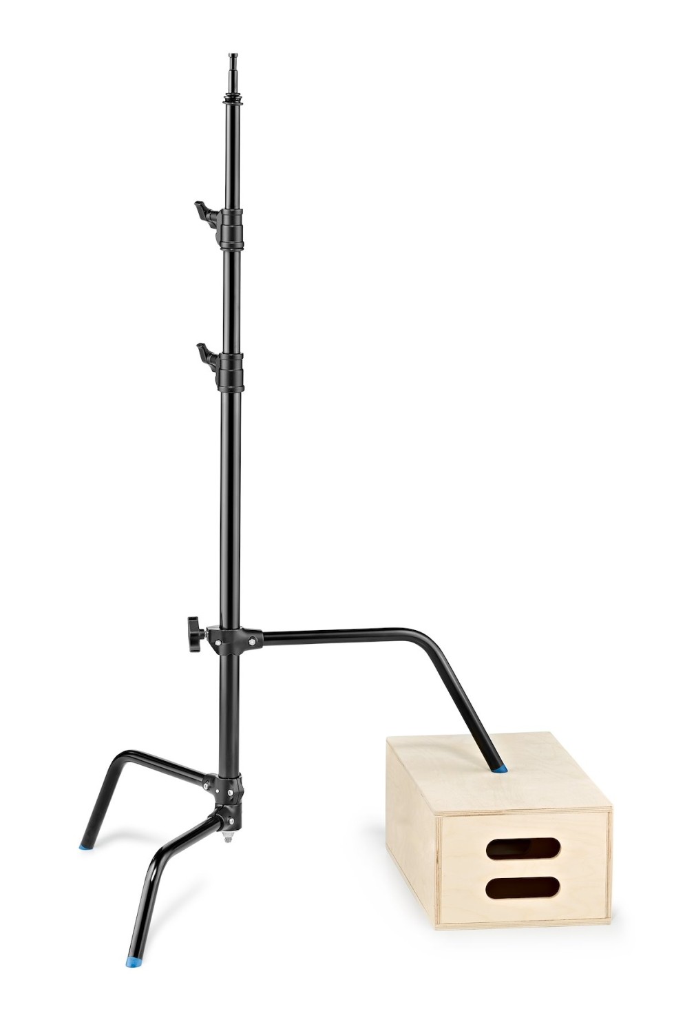 Schildkrötenfuß aus verchromtem Stahl in schwarzer Ausführung mit 3 Abschnitten und 2 Setzstufen. Die Beine lassen sich für eine einfache Lagerung flach zusammenlegen. Dieser Ständer hat eine maximale Nutzlast von 10 kg und eine maximale Höhe von 3,28 m. Er verfügt über ein Schiebebein für die einfache Verwendung auf unebenen Oberflächen. Der Ständer ist auch in verchromtem Stahl erhältlich.