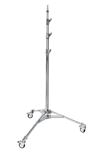 Der Avenger A5043 Roller Stand 43 mit niedriger Basis ist ein stabiles Stativ aus verchromtem Stahl und Aluminium mit gebremsten Rollen, drei ausziehbaren Abschnitten und einem 5/8"-Baby-Bolzen, das bis zu 12 kg tragen kann und eine maximale Höhe von 430 cm erreicht.