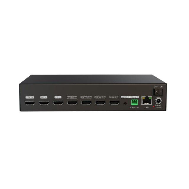 Externe HDMI-Echtzeit-Chroma-Key-Box mit 3x 4K-HDMI-Eingängen und 4x 4K-HDMI-Ausgängen. One-Touch-Smart-Keying: Schnell und präzise, ideal für komplexe Hintergründe. Green/Blue Screen-Unterstützung: Geeignet für vielfältige Szenarien mit professionellen Ergebnissen. Externer Audio- und Tally-Eingang: Ideal für die Koordination mehrerer Kameras.