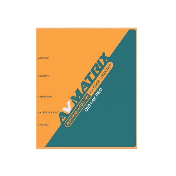 Der AVMatrix DE21-4K PRO ist ein kompakter, professioneller 4K60 HDMI ↔ NDI-Konverter, der echte NDI mit voller Bandbreite in jeden HDMI-Workflow bringt. Er unterstützt sowohl NDI|HX als auch Full NDI (bis zu 250 Mbit/s) und liefert makelloses YCbCr 4:2:2 8-Bit-Video ohne wahrnehmbare Kompressionsartefakte – perfekt für Live-Produktionen, IMAG oder Studiointegrationen.