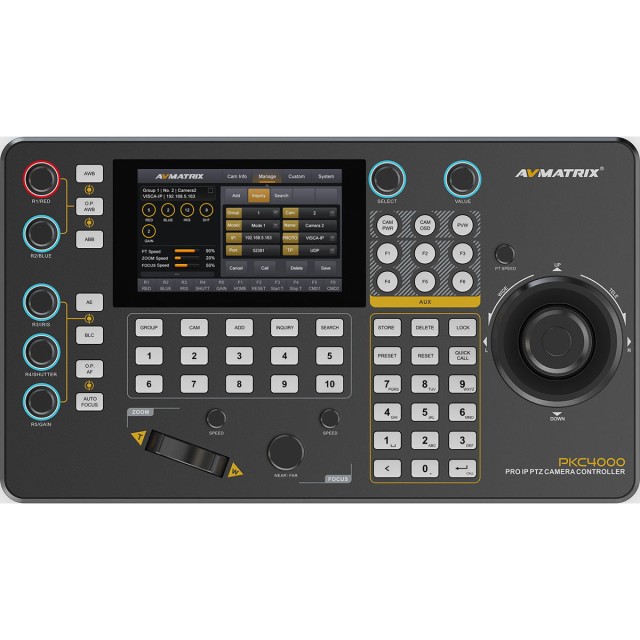 Mit einem 5-Zoll-Touchscreen, einem 4D-Joystick und Unterstützung für Visca-, Pelco P&D-, Onvif- und IP-Protokolle verwaltet dieser Controller bis zu 100 PTZ-Kameras mit Echtzeit-Videodekodierung. Steuern Sie Belichtung, Blende, Fokus und Bewegung mühelos. Mit PoE- oder 12-V-Gleichstromversorgung ist er ideal für Studios, Live-Events und Broadcast-Umgebungen. NDI-Version.
