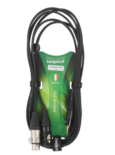 Das Bespeco EAYMS2FX300R ist ein XLR(F)-zu-3,5-mm-TRS-Verbindungskabel (3 m, schwarz) mit sauerstofffreien Kupferleitern (OFC), halbleitendem PVC-Innenmantel für rauschfreie Übertragung, 92 % Spiralabschirmung, vergoldeten Aluminiumsteckern mit modernisierter Sicherung am XLR(F) und strapazierfähigem PVC-/vulkanisiertem Silikonmantel – für zuverlässige High-Fidelity-Audioqualität in professionellen Setups.
