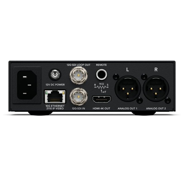 Dieses Modell wurde entwickelt, um die Verwendung der neuesten OLED-Fernseher für eine genaue Farbüberwachung zu ermöglichen, zum Beispiel in Farbkorrektur- und Schnitträumen. Der Blackmagic 2110 IP SDI to HDMI 12G verfügt über zwei analoge XLR-Audioausgänge für die Überwachung, die eine ferngesteuerte Lautstärkeregelung und benutzerdefinierte Verzögerungseinstellungen für den Anschluss aktiver Lautsprecher ermöglichen. Er verfügt über eine variable Verstärkung und Verzögerung für eine perfekte AV-Synchronisation und 3D-LUTs für eine genaue Farbkalibrierung von HDMI-Displays. Das Gerät verfügt über ein frontseitiges LCD-Display mit Videovorschau, Audiopegeln und Menüs sowie über einen Lautsprecher- und Kopfhörerausgang.