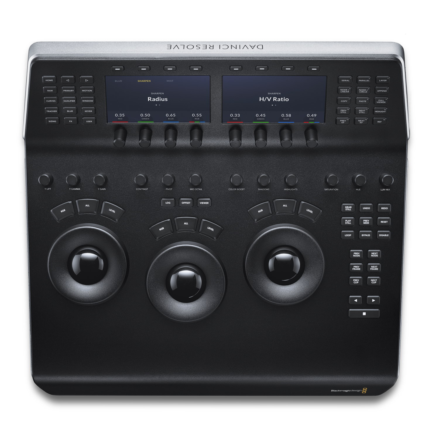 Dieses flache Panel verfügt über 3 hochauflösende Trackballs und 12 präzisionsgefertigte Knöpfe für den Zugriff auf die wichtigsten Farbkorrekturwerkzeuge. Es gibt Tasten zum Umschalten zwischen Log- und Primärrädern, eine Taste für die Vollbildwiedergabe und eine Reihe von Tasten für allgemeine Funktionen und die Navigation im Arbeitsbereich.
