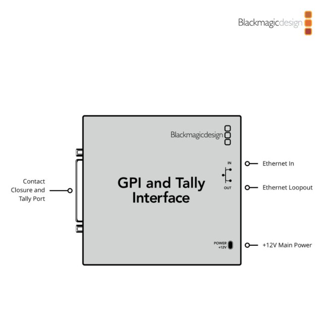 Die GPI- und Tally-Schnittstelleneinheit von Blackmagic Design ist ein Ethernet-Gerät, das acht Ausgänge mit Relaiskontakten für die Signalisierung von Oberlichtern bietet. Tally-Signale werden über das Ethernet-Netzwerk von den Umschaltern der ATEM-Serie an GPI- und Tally-Schnittstellenmodule gesendet , die mit demselben Netzwerk verbunden sind. Ein Videogerät, das den Contact-Link-Signalisierungsstandard unterstützt, wie z. B. Blackmagic Design SmartView Duo oder SmartView HD-Produkte , kann an das GPI- und Tally-Schnittstellenmodul angeschlossen werden (mit einem Break-out-Kabel; nicht im Lieferumfang enthalten)
