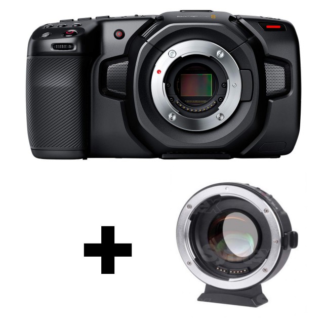 Ein vergünstigtes Set aus Blackmagic Design Pocket Cinema Camera 4K und Viltrox EF-M2 II "Speed Booster" Adapter. Der Viltrox EF-M2 II-Adapter passt nicht nur den MFT-Anschluss an Canon EF-Objektive an, sondern verkürzt auch die Brennweite der Objektive (0,71x) und erhöht deren Blendenöffnung (bis zu einer Blendenzahl). Außerdem bietet es ein 1/4"-Gewinde für Kamerakäfige und AF-Unterstützung für Canon-Objektive.