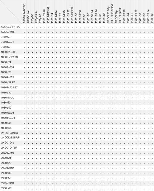 Mit dem Teranex AV-Konverter erhalten Anwender ein leistungsstarkes Tool zur Konvertierung von Standards (1089 verschiedene Konvertierungsoptionen), das alle gängigen Formate bis zu einer Auflösung von 2160p60 und in voller 10-Bit-Qualität unterstützt. Wie andere Teranex-Produkte verwendet auch die Teranex AV proprietäre Algorithmen und leistungsstarke DSP-Schaltkreise für die ultimative transparente Umwandlung. Es bietet fortschrittliche Methoden zur Entfernung von Halbbildern, zur Bildvergrößerung oder -verkleinerung, zur Rauschunterdrückung, zur automatischen Erkennung/Entfernung von Kadenz sowie zur Erhaltung von Timecode und anderen Zusatzdaten