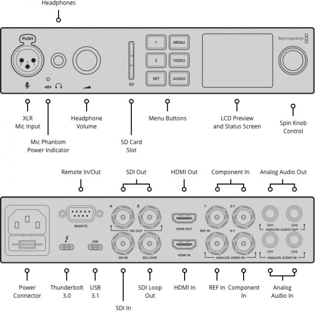 UltraStudio 4K Mini ist eine leicht zu transportierende Videoaufnahme- und Wiedergabelösung mit Thunderbolt 3, 12G-SDI und HDMI 2.0 Schnittstellen... Er unterstützt alle standardmäßigen 8- und 10-Bit-Videoformate bis zu DCI 4Kp60 bzw. 12-Bit bis zu DCI 4Kp30. Das kompakte Gehäuse lässt sich problemlos in ein Rack einbauen (und als Standalone-Gerät betreiben), und die Bedienung wird durch ein Frontpanel mit Bedientasten, LCD-Vorschaudisplay, Mikrofoneingang (XLR), 1/4-Zoll-Kopfhörerausgang und SD-Kartensteckplatz, der eine einfache Handhabung des aufgenommenen Materials ermöglicht, erheblich erleichtert. Auf der Rückseite befindet sich eine USB-C-Schnittstelle für den Anschluss von Tastatur und Maus an einen Host-Computer sowie SDI-, HDMI- und analoge A/V-Schnittstellen; die Thunderbolt 3-Schnittstelle unterstützt auch das Aufladen eines angeschlossenen Laptops (bis zu 45 W)