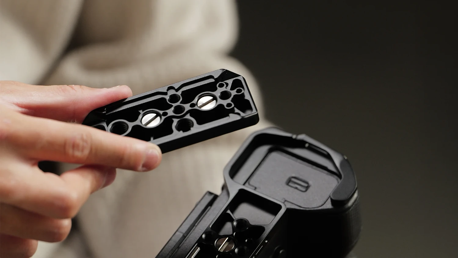 Die integrierte bidirektionale Arca-Swiss-Bodenplatte ermöglicht eine schnelle Befestigung und einfache Positionierung auf Gimbals und Stativen. Der Käfig unterstützt komfortables vertikales Fotografieren, da die Griffe mit integrierten 1/4”-20-Gewinden befestigt werden können.