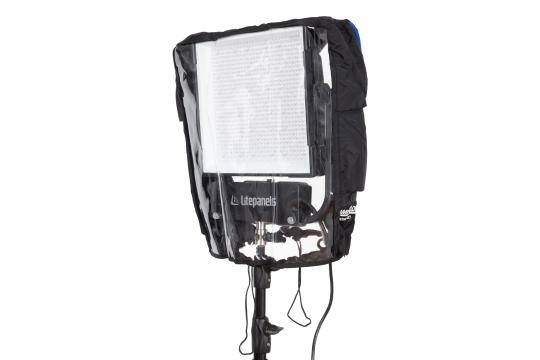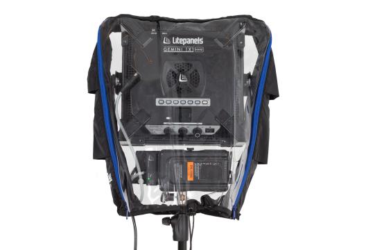 Die Abdeckung verhindert, dass Wasser an die V-Lock- oder Gold-Mount-Batterie, die Steuereinheit oder einen AC/DC-Adapter gelangt. Die hochdichte Schockschnur an der Unterseite ermöglicht die Befestigung der Abdeckung am Beleuchtungsständer oder einer anderen Montagelösung. Gleichzeitig verringert die Länge die Möglichkeit, dass Wasser durch den Boden in das Panel eindringt. Die Gesamtlänge der Abdeckung beträgt 52 cm (20,5").