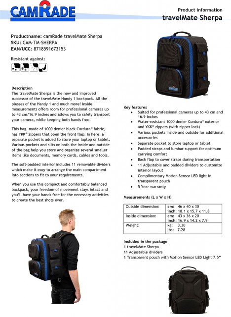 Der travelMate Sherpa Kamerarucksack ist der Nachfolger des beliebten travelMate Handy 1. Er bietet viel Platz für den sicheren Transport von Kameras bis zu 43 cm Länge, strapazierfähiges Material (Cordura®) und Qualitätsreißverschlüsse (YKK®), ein separates Fach für Tablet/Laptop auf der Vorderseite und natürlich auch Innen- und Außentaschen für den Transport von Dokumenten, Speicherkarten, Kabeln usw.