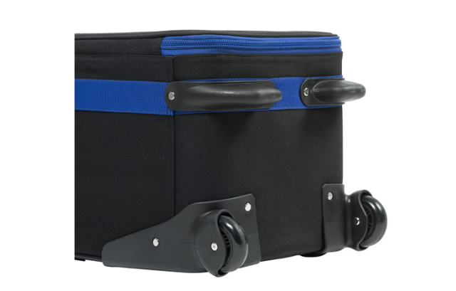 Trageoptionen: Integrierte Rollen, gepolsterter Schultergurt, drei Griffe aus Wildleder