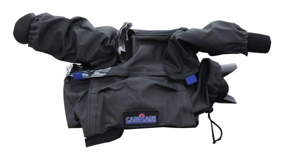 Diese Regenhülle bietet Platz für den Monitor auf der Kamera, der während des Betriebs aufgeklappt werden kann. Er verfügt über durchsichtige Vinylfenster für maximale Sichtbarkeit beim Einstellen des Menüs, der Audioeingangsstufe und anderer Bedienelemente.