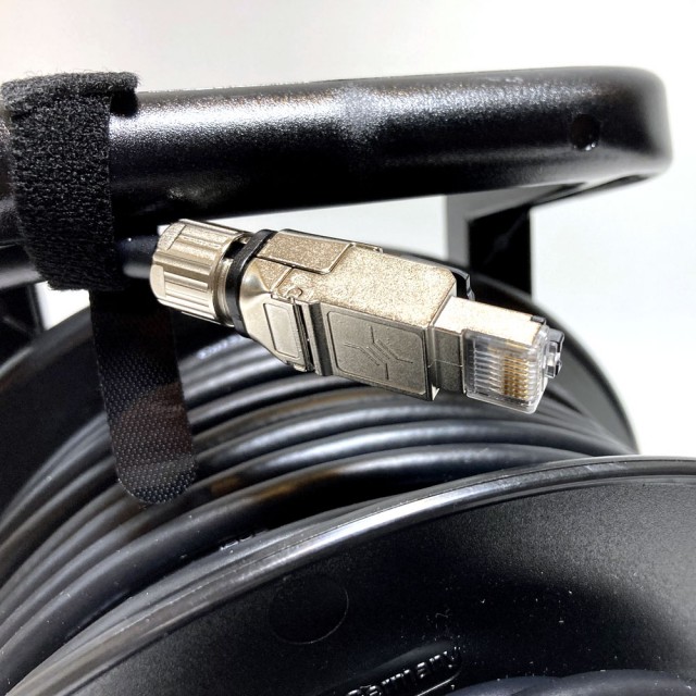 Flexibles und extra starkes Canare RJC5ES-4P-BS CAT5e STP-Netzwerkkabel mit Außendurchmesser 6,7 mm mit Telegartner RJ45-Anschlüssen, gewickelt auf Schill-Kabeltrommel. Ethernet-Kabel werden nicht nur für Computernetzwerke verwendet, sondern in letzter Zeit auch für digitale Audionetzwerke, Netzwerkkameras und HDBaseT-Übertragungen. Die Gesamtlänge des Kabels ist einschließlich der Stecker angegeben.