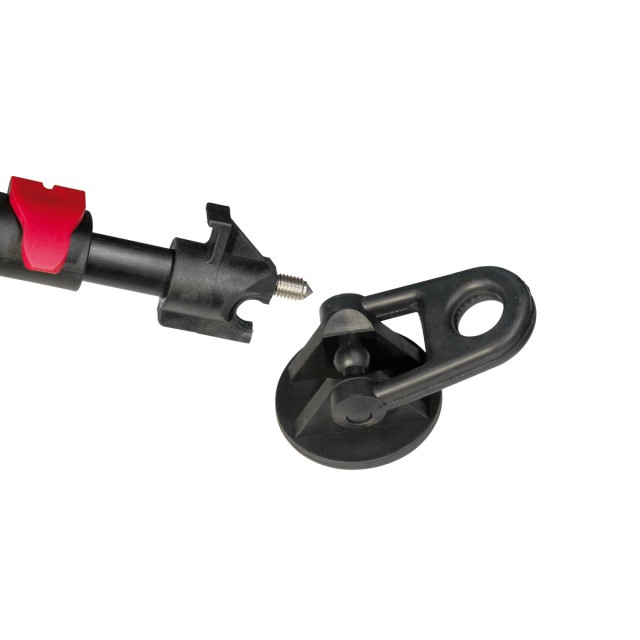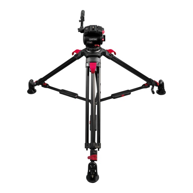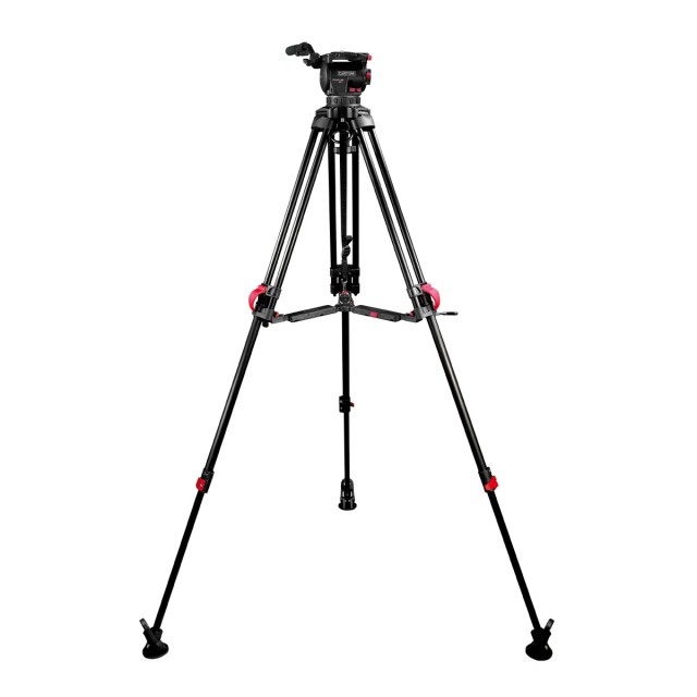 Stativ mit Fluidkopf Focus 10, Red Lock Alu-Beinen, Smart Lock-Mittelstück, Gummistiefeln und Tragetasche.