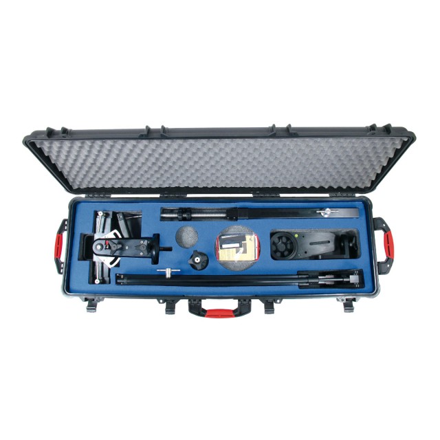 Die JIBO-Kit-Konfiguration umfasst einen robusten, wasserdichten und leichten Kunststoffkoffer mit Rädern, einen 100-mm-Basiskopfaufsatz mit Mehrfachausrichtung, von links nach rechts und oben/unten sowie 2 Wasserwaagen.