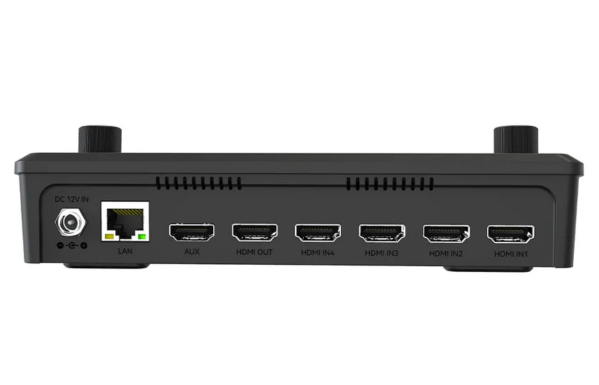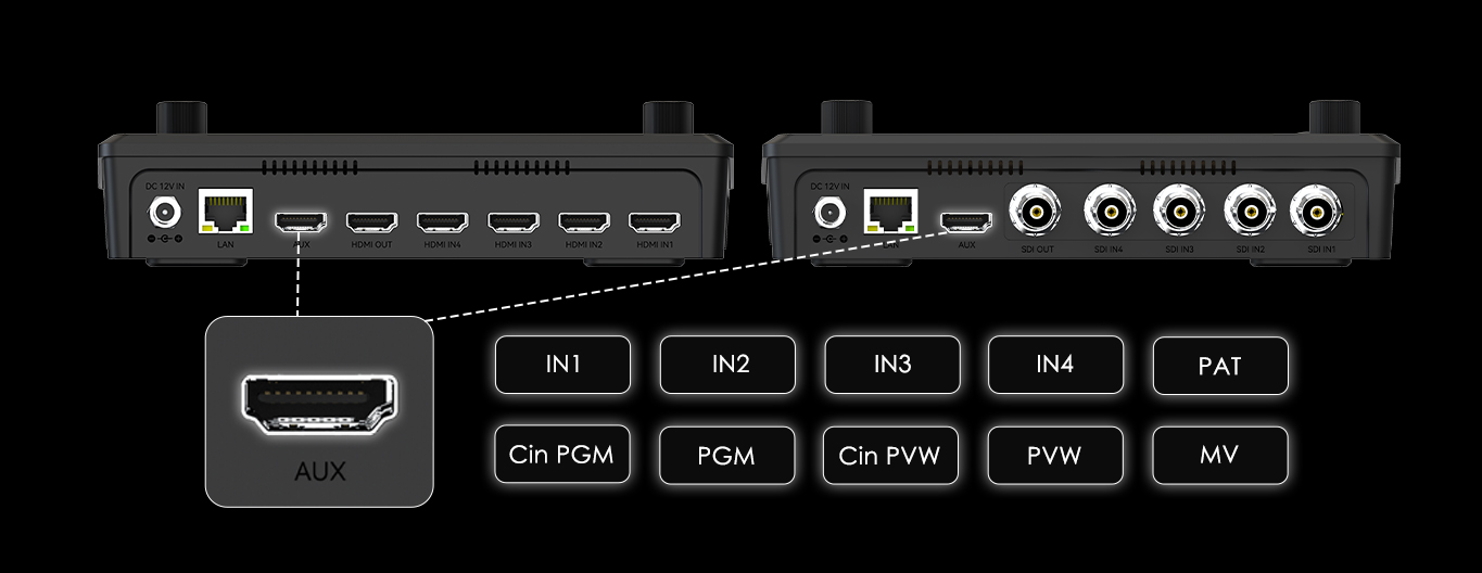 Anpassbarer AUX-HDMI-Ausgang – Mixer Plus verfügt über einen vielseitigen AUX-HDMI-Ausgang, über den Benutzer das Ausgangssignal aus mehreren Optionen anpassen können, darunter IN1, IN2, IN3, IN4, PGM, Clean PGM, PVW, Clean PVW, PAT und Multi View – für maximale Flexibilität bei unterschiedlichen Produktionsanforderungen.