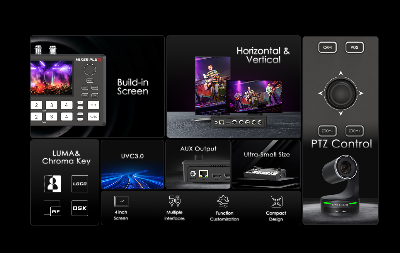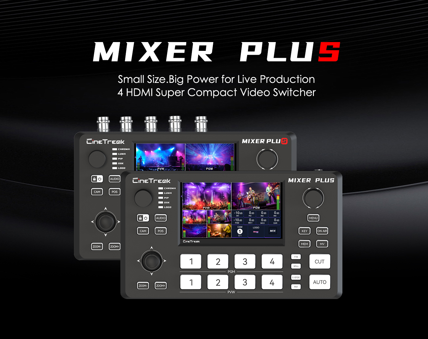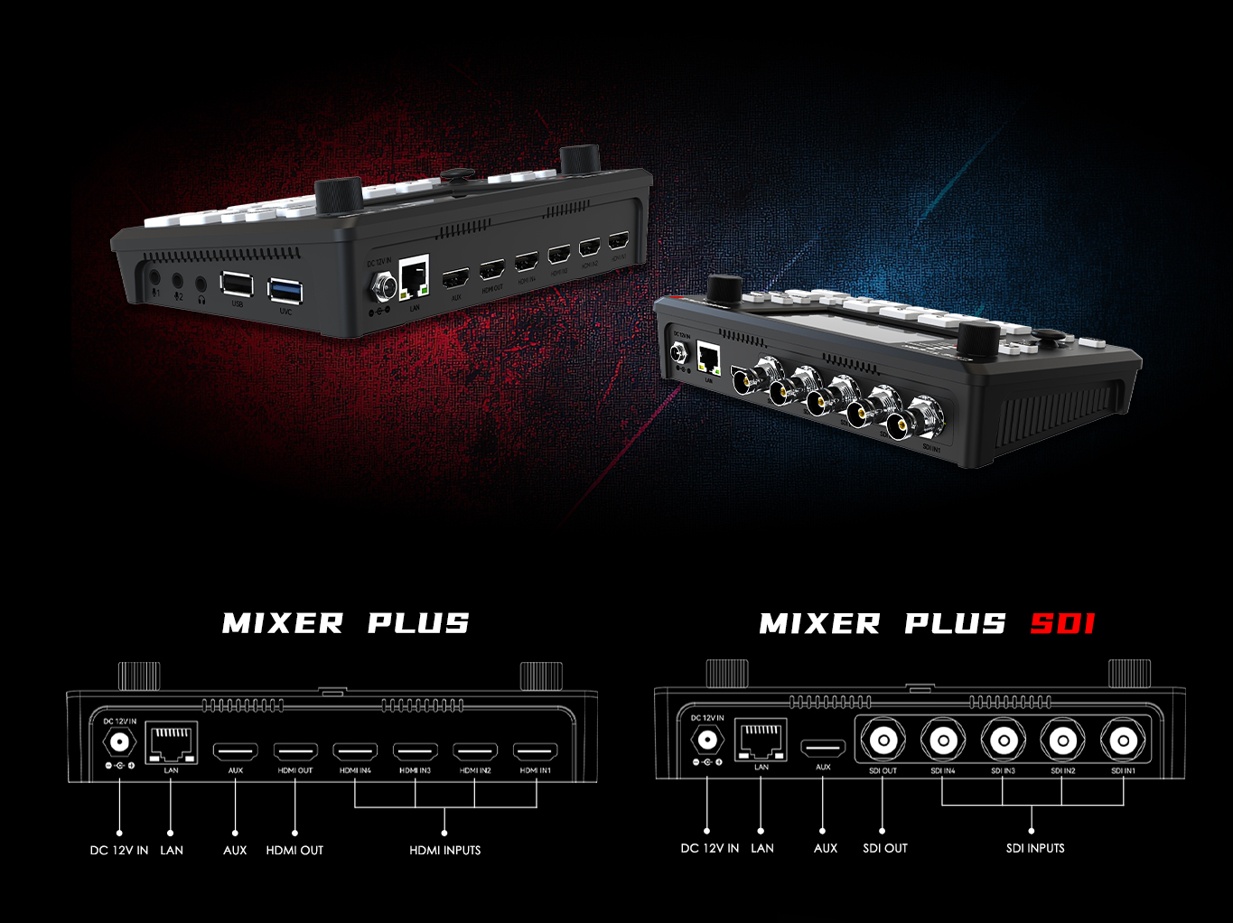 Mixer Plus ist ein leistungsstarker und kompakter Videoumschalter, der für Live-Streaming, Event-Produktionen und Multi-Kamera-Übertragungen entwickelt wurde. Er ist in zwei Versionen erhältlich, um unterschiedlichen Workflow-Anforderungen gerecht zu werden: Mixer Plus mit vier HDMI-Eingängen und Mixer Plus SDI mit vier SDI-Eingängen für broadcasttaugliche Signal-Kompatibilität. Beide Modelle unterstützen nahtloses Mehrkanal-Umschalten, einen anpassbaren AUX-Ausgang und Multi-View-Monitoring in Echtzeit. Mit bis zu 30 integrierten Übergangseffekten – darunter Mix und DIP – können Benutzer professionelle Szenenwechsel mit einstellbarer Dauer erstellen. Die Audioflexibilität wird durch zwei Mikrofoneingänge und eine Kopfhörer-Monitoring-Buchse gewährleistet, die eine Echtzeit-Tonsteuerung ermöglichen. Der Switcher unterstützt auch die PTZ-Kamerasteuerung über VISCA over IP, sodass bis zu vier Kameras mit mehreren Voreinstellungen pro Gerät angeschlossen werden können. Zu den weiteren Produktionswerkzeugen gehören Chroma Key, Luma Key, Bild-in-Bild (PIP), Downstream Keying (DSK) und Logo-Overlays. Ausgestattet mit einer USB 3.0 UVC-Schnittstelle für unkomprimiertes HD-Streaming und einem USB 2.0-Anschluss zum Importieren von Mediendateien wie Logos und Hintergründen bieten Mixer Plus und Mixer Plus SDI eine komplette, vielseitige Switching-Lösung, die speziell auf professionelle Content-Ersteller und Live-Produktionsteams zugeschnitten ist.