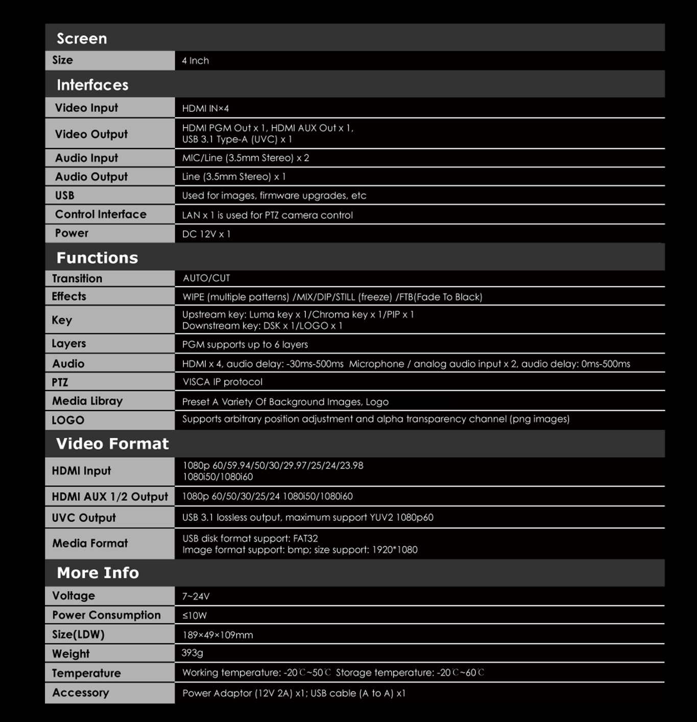 Multi-View-Überwachung (MV) – Mit der Multi-View-Funktion (MV) können Benutzer alle Eingangsquellen gleichzeitig auf einem einzigen Display überwachen. Sie bietet Echtzeit-Vorschauen jedes Videoeingangs zusammen mit speziellen Programm- (PGM) und Vorschau- (PVW) Fenstern, Auflösungsanzeigen und Audiopegelanzeigen. Dies ermöglicht eine präzise Signalüberwachung und nahtloses Umschalten während der Live-Produktion. Der MV-Modus ist ideal für Multi-Kamera-Setups, verbessert die Betriebseffizienz und gewährleistet professionelle Sendequalität.