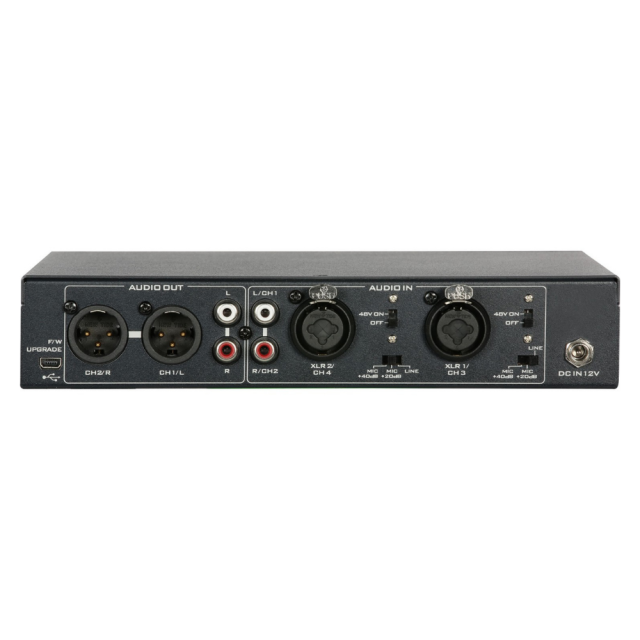 Das 2-Zoll-LCD-Display auf der Vorderseite ermöglicht den Zugriff auf alle Funktionen, die der AD-300 bietet. Kompressoren und Limiter regeln die Lautstärke der Audioeingänge mit einem maximalen Kompressionsverhältnis von 100:1 im Kompressor. Expander und Gates heben den Klang bestimmter Instrumente und menschlicher Stimmen hervor, wobei der Expander ebenfalls ein maximales Dämpfungsverhältnis von 100:1 aufweist. Die integrierte symmetrische und unsymmetrische Audiowandlung sorgt dafür, dass die Audioausgabe immer im richtigen Format erfolgt. Mit dem Line/MIC-Schalter können Sie zwischen Mikrofon- und Line-Eingang umschalten. Außerdem ist eine 48-V-Phantomspeisung zur Versorgung angeschlossener Kondensatormikrofone integriert. Diese leistungsstarken Funktionen sind in einem kompakten Gehäuse untergebracht, das sich ideal für Standalone- und Rackmount-Anwendungen eignet.