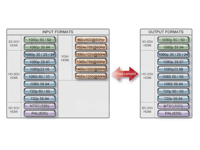 (YUV/RGB): 1080p60/50, 1080p59.94, 1080p30/25/24, 1080p29.97, 1080p23.98, 1080i60/50, 1080i59.94, 720p59.94, 720p60/50, 576p, 480p, VGA, 1600x1200@60Hz, 1400x1050@60Hz, 1366x768@60Hz, 1280x1024@60Hz, 1024x768@60Hz, 800x600@60Hz