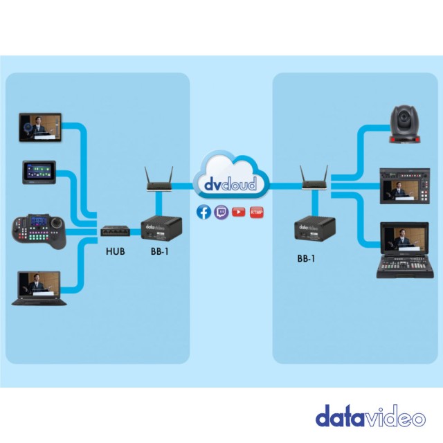Ein einziges BB-1-Paar ermöglicht die Steuerung fast ALLER IP-steuerbaren Geräte über das Internet, einschließlich der PTZ-Kameras und Umschalter von Datavideo.