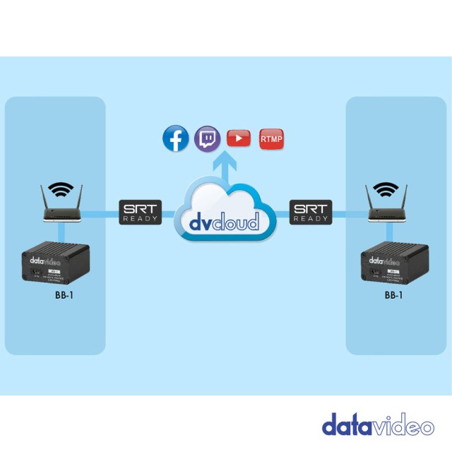 Der BB-1 verwendet DVIP, das proprietäre IP-Protokoll von Datavideo, mit dem alle IP-fähigen Geräte von Datavideo im Netzwerk jederzeit und von überall aus ferngesteuert werden können. Alles, was Sie benötigen, ist ein dvCloud-Streaming-Service-Abonnement, einen BB-1 auf der Seite des Veranstaltungsortes und einen weiteren BB-1 auf einer entfernten Seite.