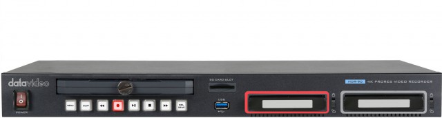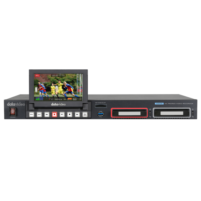 Der Datavideo HDR-90 ist ein Rackmount-Videorecorder mit LCD, der 10-Bit ProRes-Dateien mit einem Seitenverhältnis von 4:2:2 kontrolliert und verwaltet. Der HDR-90 unterstützt UHD 12G SDI I/O und 4K HDMI Input/Output, sowie DVIP (Ethernet), GPI und RS-232.