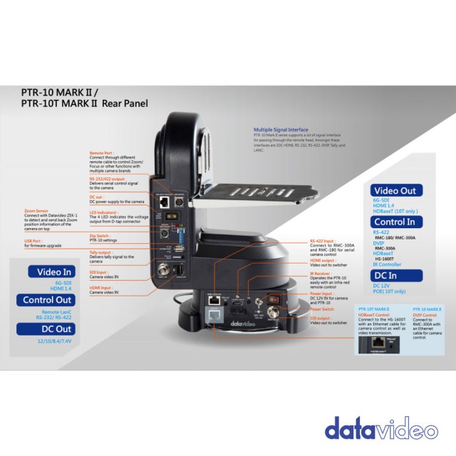 Der PTR-10 MARK II kann über den mitgelieferten IR-Controller, den VISCA-Protokoll-Controller, den Datavideo RMC-180 Kamera-Controller, das RMC-300A Universal Remote-Control Panel gesteuert werden und ist kompatibel mit DVIP over Ethernet und anderen Integrationslösungen wie Crestron.