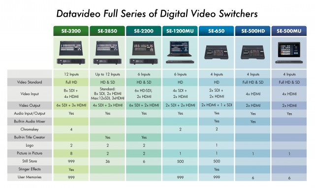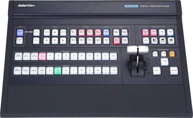 Datavideo SE-3200 je profesionální 12kanálová 1080p režie s velkou nabídkou efektových funkcí včetně klíčů (chroma/luma/lineární), obrazu v obraze, stíraček apod. Nechybí samozřejmě ani datový prostor pro grafiku (500+), animované prolínací efekty, generátor titulků (kompatibilní s titulkovací aplikací Datavideo) nebo genlock. Modulární provedení dovoluje instalovat hlavní jednotku do 19" přístrojové skříně režií nebo přenosových vozů a ovládací pult umístit do režijního stolu.