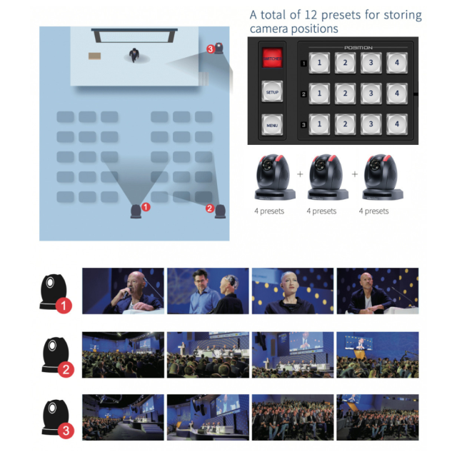 Die integrierten Kamerasteuerungsfunktionen des ShowCast 100 ermöglichen Ihnen die gleichzeitige Steuerung von drei PTZ-Kameras. Sie können die Voreinstellungen für die Objektivposition direkt speichern, die Positionen in Echtzeit schwenken und neigen sowie in eine Aufnahme hinein- und herauszoomen. Darüber hinaus können Sie den Weißabgleich, die Blende und den Spiegelmodus jeder Kamera einstellen. Obwohl ShowCast 100 nur drei PTZ-Kameras steuern kann, können Sie bis zu vier Voreinstellungen pro Kamera speichern, so dass Sie insgesamt 12 verschiedene Blickwinkel für Ihre Produktion haben. Die 12 gespeicherten Presets ermöglichen es dem Regisseur, durch Drücken der entsprechenden Preset-Tasten sofort zwischen verschiedenen Kamerawinkeln auf dem ShowCast 100 zu wechseln. Über die intuitive Touchscreen-Benutzeroberfläche können Sie den Fokus, die Blende und den Weißabgleich der Kamera ganz einfach einstellen. Die Einstellungen eines bestimmten Programms können zur späteren Verwendung gespeichert werden.