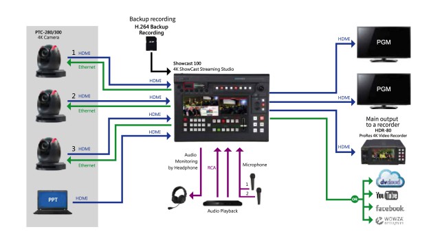Der ShowCast 100 ist ein brandneuer 4K 4-Kanal Touch Panel Switcher mit 7 Hauptfunktionen. Er kann Video umschalten, Text und Grafiken einblenden, Kameras steuern, live streamen, aufnehmen und Audio mischen - alles mit einem einzigen Gerät. Das 14-Zoll-Touchpanel ähnelt einem Tablet und ermöglicht einen einfachen und intuitiven Zugriff auf die Funktionen des Umschalters. Das einzigartige All-in-One-Design rationalisiert Ihren Videoproduktions-Workflow, indem es die Anzahl der anzuschließenden externen Geräte reduziert. Showcast100 ist leicht und kompakt. Seine Mobilität macht ihn ideal für jede Live-Produktionsumgebung.