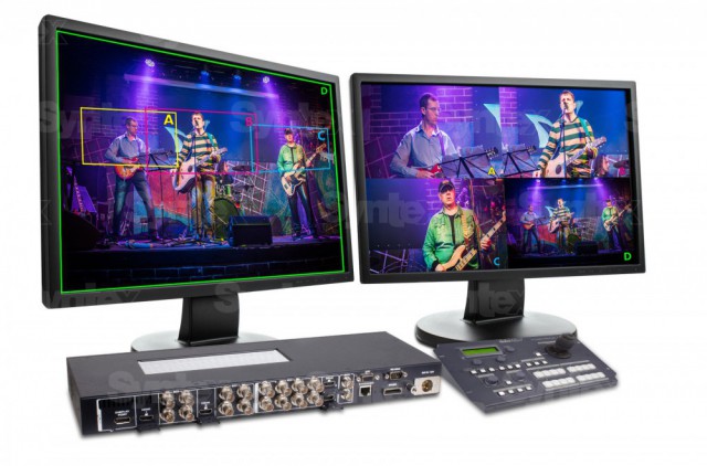 Zum Beispiel. Der RMC-185-Controller kann dann verwendet werden, um bis zu vier Benutzerfenster aus dem 4K-Signal der Kamera zu erstellen, wobei das Schwenken und Zoomen über den Joystick erfolgt. Die folgenden virtuellen Aufnahmen können entstehen