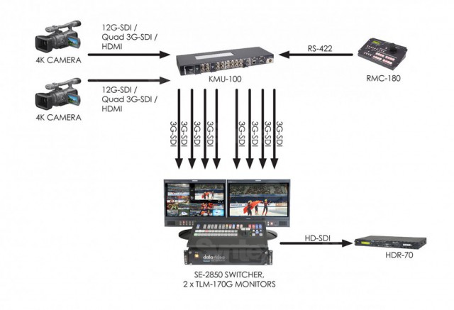 Das neue KMU-100 wandelt den 4K/UHD-Kameraausgang in vier diskrete 16x9 HD-Streams auf einer HD-SDI-Schnittstelle um, die durch einen vom Benutzer einstellbaren Schnitt aus den ursprünglichen 4K-Daten erzeugt werden! Mit dem KMU-100 und einer (oder zwei) 4K/UHD-Kameras kann der Eindruck einer Multi-Kamera-Produktion einfach und kostengünstig erzeugt werden.