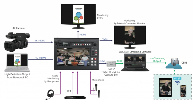 DerDatavideo KMU-200 ist ein All-in-One-Video-Overhead mit Streaming-, Audiomixer- und Kamerasteuerungsfunktionen. Es ist ein Gerät, an das eine 4K-HDMI-Kamera und ein zusätzlicher HDMI-Videoeingang (z. B. Laptop) angeschlossen werden können. Von dem 4K-Videosignal können dann bis zu 4 HD-Aufnahmen (Kameras) gemacht werden. Die Einstellungen der einzelnen Schnitte (Shots) können über das LCD-Touch-Display oder über andere Bedienelemente, die das KMU-200 bietet, angepasst werden.