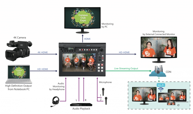 Der zusätzliche HDMI-Eingang bietet die Möglichkeit, einen zusätzlichen Kamerawinkel zu zeigen oder den Display-Ausgang eines Computers für eine Präsentationssoftware an das KMU-200 anzuschließen.