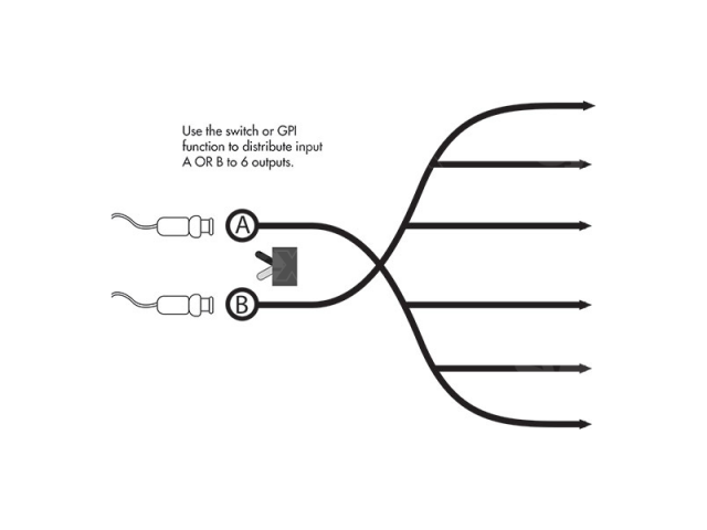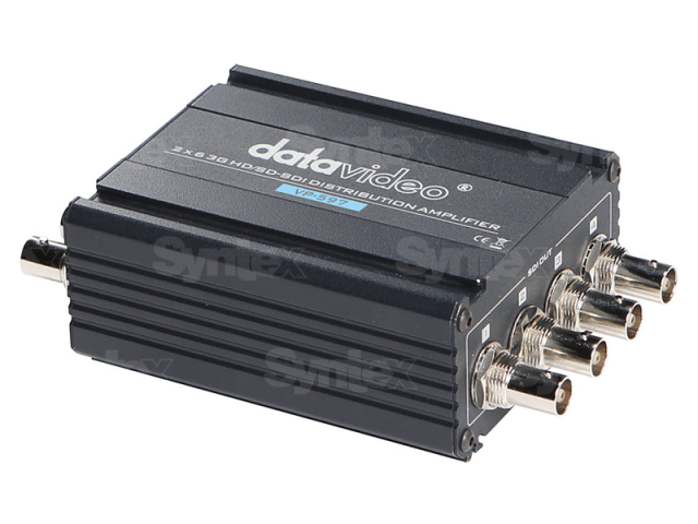 DerDatavideo VP-597 ist ein SDI-Verteiler mit 2 Eingängen, 6 Ausgängen und einem A/B-Eingangsumschalter. Er unterstützt 3G/HD/SD-SDI-Videosignale mit eingebettetem Audio und Re-Clock für größere Entfernungen.