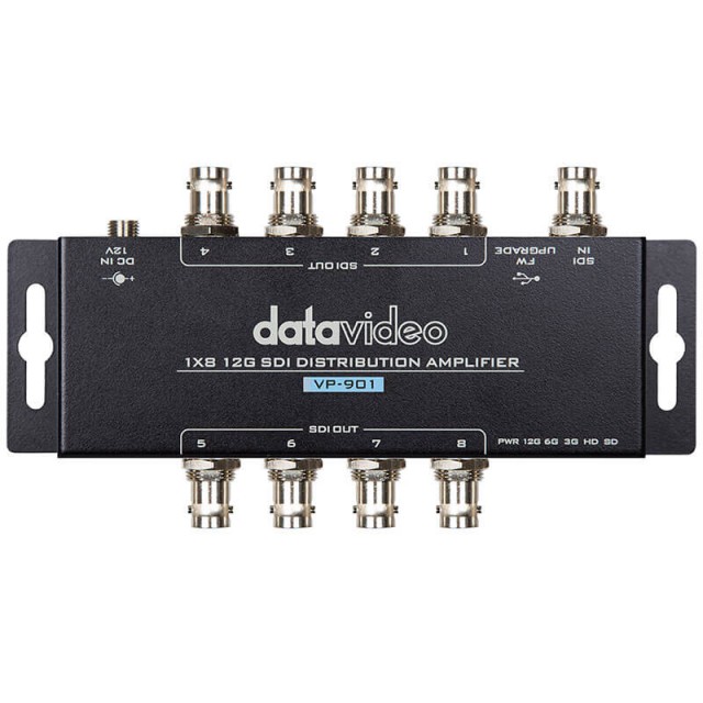 Der 12G-SDI-Signalverteilungsverstärker ist in der Lage, einen 12G-, 4K-, HD- oder SD-SDI-Eingang auf 8 Ausgänge zu replizieren. Es ist ein zuverlässiges Gerät für z.B. die gleichzeitige Anzeige von SDI-Signalen auf mehreren Monitoren.