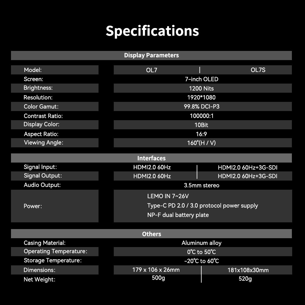Der Desview OL7S ist ein leistungsstarker 7-Zoll-OLED-Monitor, der für Filmemacher, Broadcaster und Videoprofis entwickelt wurde. Sein ultrahelles 1.200-Nit-Display bietet eine hervorragende Sichtbarkeit, sogar in Außenumgebungen, während das Kontrastverhältnis von 100.000:1 und die 10-Bit-Farbtiefe eine außergewöhnliche Farbgenauigkeit und tiefe Schwarztöne für eine präzise Überwachung bieten.