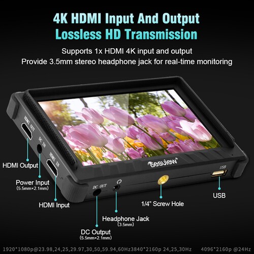 Ausgestattet mit HDMI 1.4-Ein- und -Ausgang unterstützt der Monitor Videoformate bis zu DCI 4K24 und UHD 4K30. Der P5II verfügt über professionelle Überwachungswerkzeuge wie Falschfarben, Fokusassistent, Wellenform, Zebra und anamorphotische Entzerrung (1,33x, 1,5x, 1,66x, 1,79x, 2,0x), die präzise Aufnahmen ermöglichen. Er verfügt über Tastensteuerungen für schnelle Einstellungen, mehrere Befestigungsoptionen über 1/4"-20-Gewinde und kann mit einem Akku der Sony L-Serie oder einem DC-Barrel-Eingang mit Strom versorgt werden. Mit einem Gewicht von nur 170 g ist der P5II leicht und tragbar und eignet sich ideal für DSLR-, spiegellose und Kinokamera-Setups.