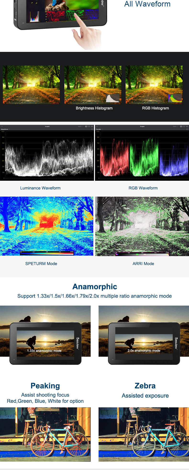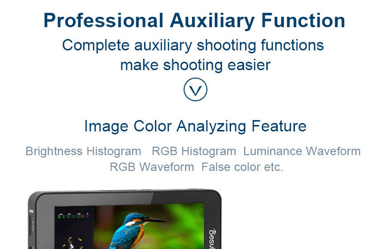 Zebra, Histogramm, Wellenform, Vektorskop, All Wave, Single Color, Peaking und Safe Area, die Ihnen bei der Belichtung, Fokussierung und Komposition helfen.