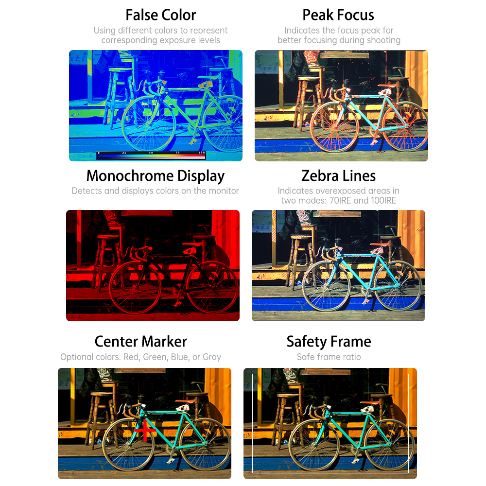 Ausgestattet mit einem kompletten Satz an Hilfsfunktionen, die das Fotografieren erleichtern. Enthält Funktionen wie Vollwellenform, Farbtemperatur, Spitzenfokus, Falschfarben, Verzerrungsfunktion, Zebramuster und Standbild sowie weitere professionelle Softwarefunktionen
