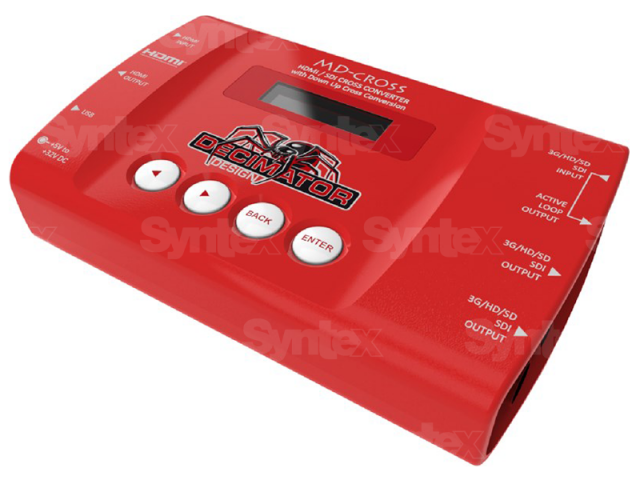 DerMD-CROSS von Decimator Design ist ein tragbarer HDMI/SDI-Cross-Cover mit Skalierung und Bildratenkonvertierung. Inklusive LCD-Display und Steuertasten. Dies ermöglicht einen einfachen Zugriff auf alle Funktionen. Er enthält einen identischen Up/Down/Cross-Wandler wie derMD-DUCC